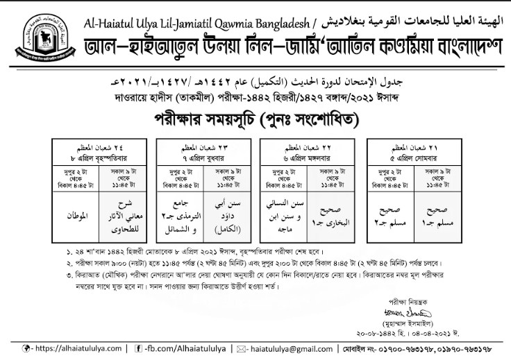 ৮ এপ্রিল বৃহস্পতিবারের মধ্যে দাওরায়ে হাদীসের অবশিষ্ট ৮ বিষয়ের পরীক্ষা শেষ হবে। সকাল ও বিকাল দু’ বেলা ২টি বিষয়ের পরীক্ষা হবে।