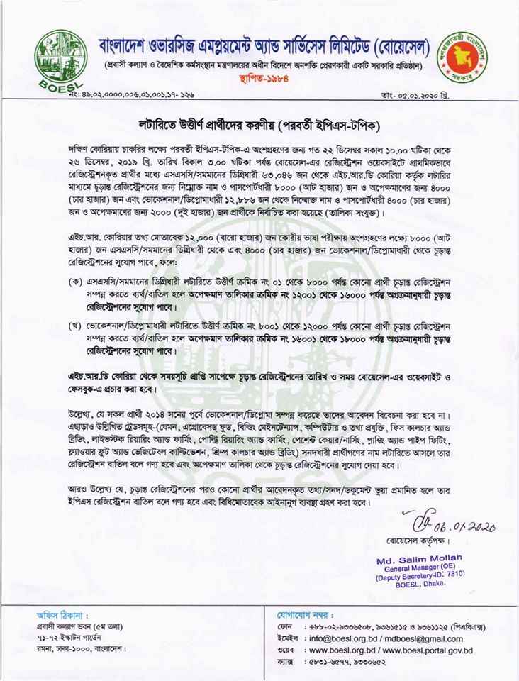 মনে রাখবেন কোরিয়া গমন করতে হলে আপনাকে আরো অন্তত পাঁচটি ধাপ অতিক্রম করতে হবে। তাই বর্তমান পেশায় নিযুক্ত থেকে এবং পরিচিত মানুষের কাছে গোপনীয়তা বজায় রেখে চেষ্টা করেন। ইন শা আল্লাহ সফল হবেন।